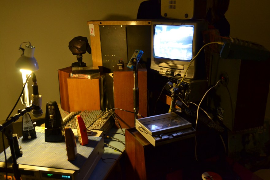 | “Vicky Clarke’s piece ‘100bpm Train Waltz’ at Staff Room 3 is a multi-sound installation piece made up of sound machines from metronomes to recordplayers. ‘100bpm Train Waltz’ is a walk around piece which has a sculptural quailty to it. At first appearing unfocused and uncalculated, it becomes clear quite quickly that ‘100bpm Train Waltz’ is a very well thought out piece which is intended to evoke feelings on every end of the spectrum. The audience’s sound experience changes dependent on proximity and location to the piece and on this basis ones perception of ‘100bpm Train Waltz’ is altered consistently. A very clever sound sculpture.”
