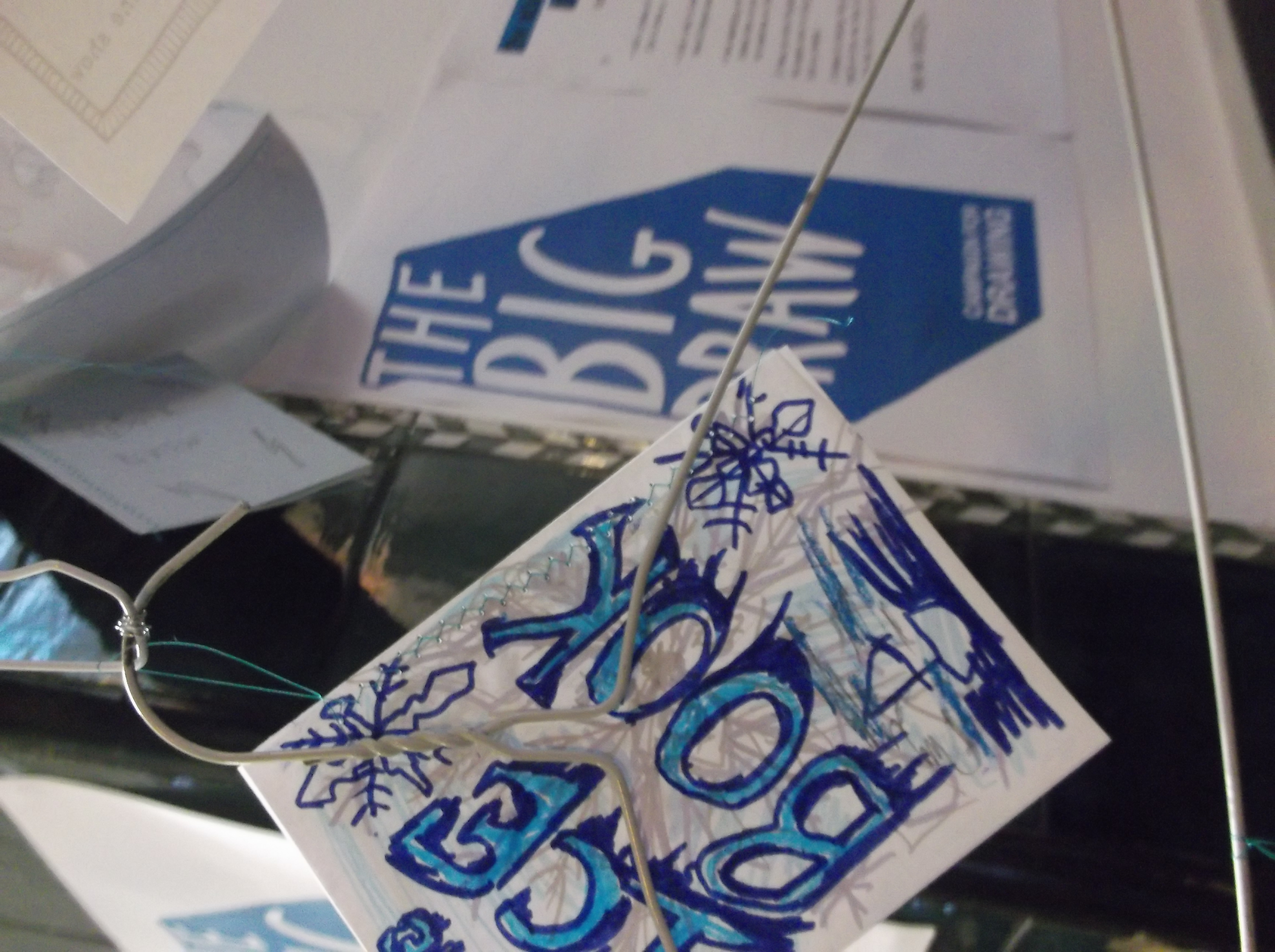 In the session we created our own miniature ice books using layers of tracing paper to build up a sequence of hand drawn images that were visible through each turn of the page. On completion the layers were stitched together with silver thread and either taken home (most people did this) or suspended on a coat hanger installation in our Cafe space.