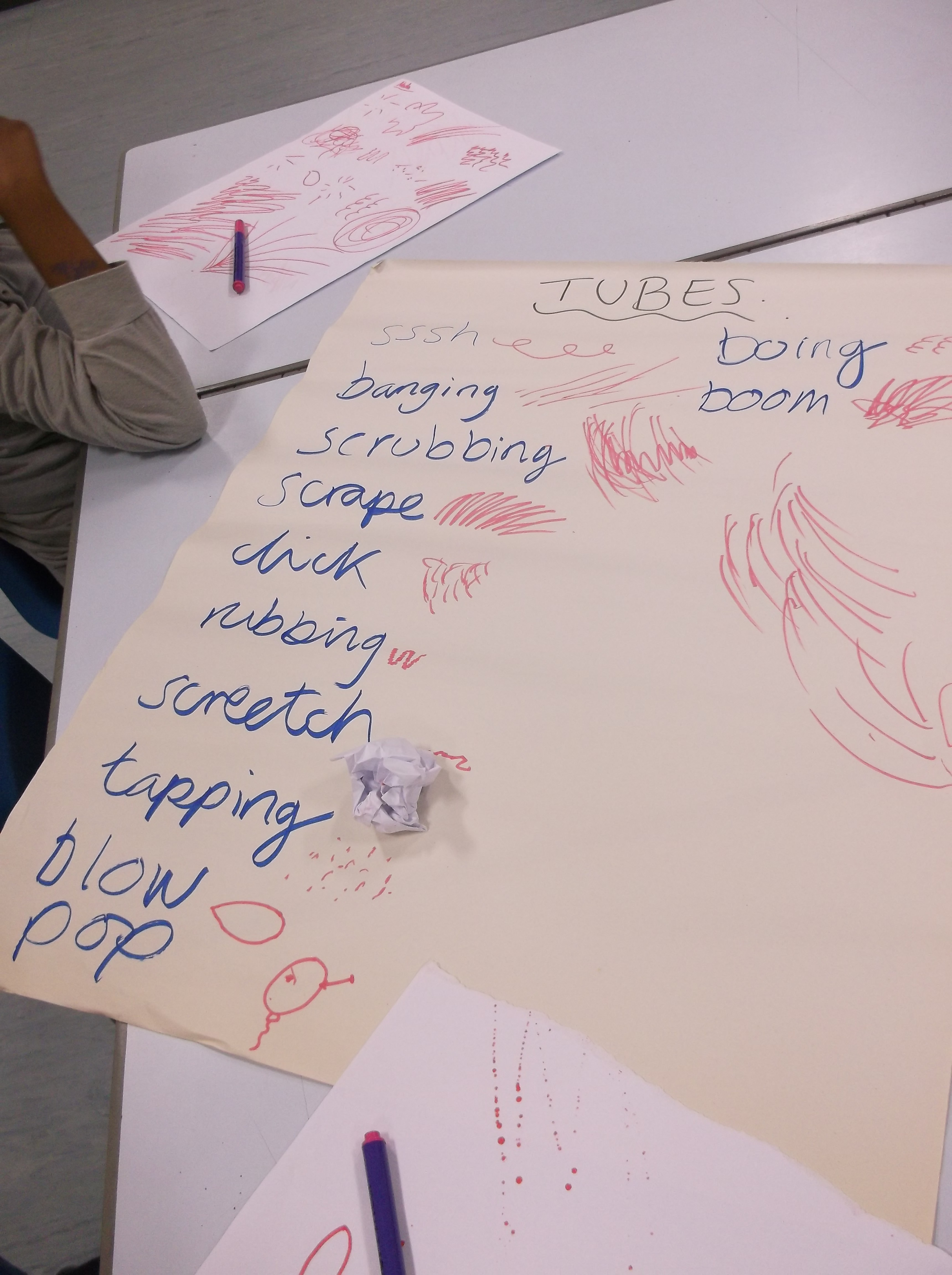 Working in teams we created four different types of instrument, these were straw flutes, tubes, shakers and drums. Through playing these instruments the groups had to decide on a variety of symbols that related to the specific sounds they could make from the materials. Taking turns we then organised ourselves into the noise orchestra and drew a graphical score which we performed at the final session.