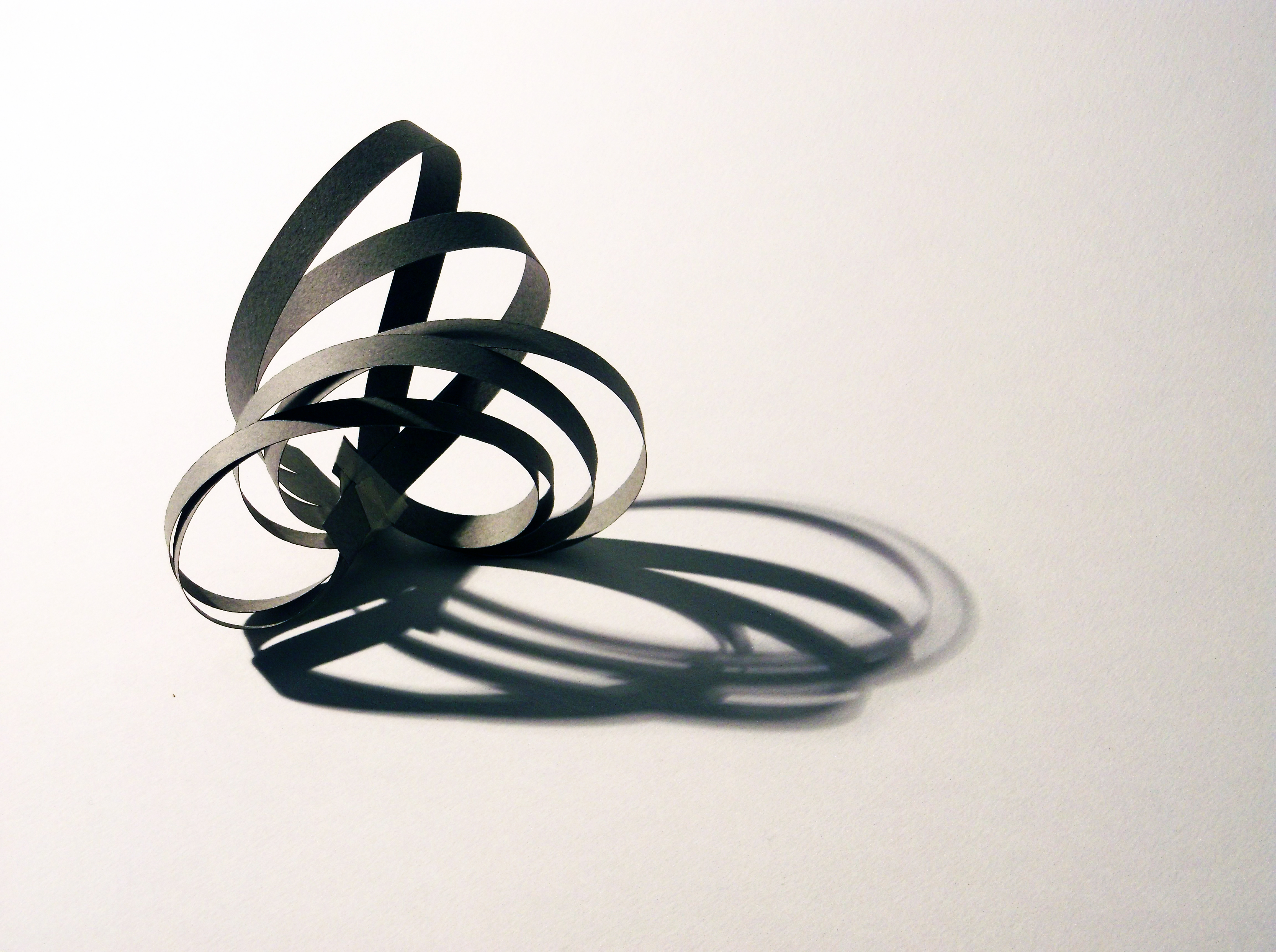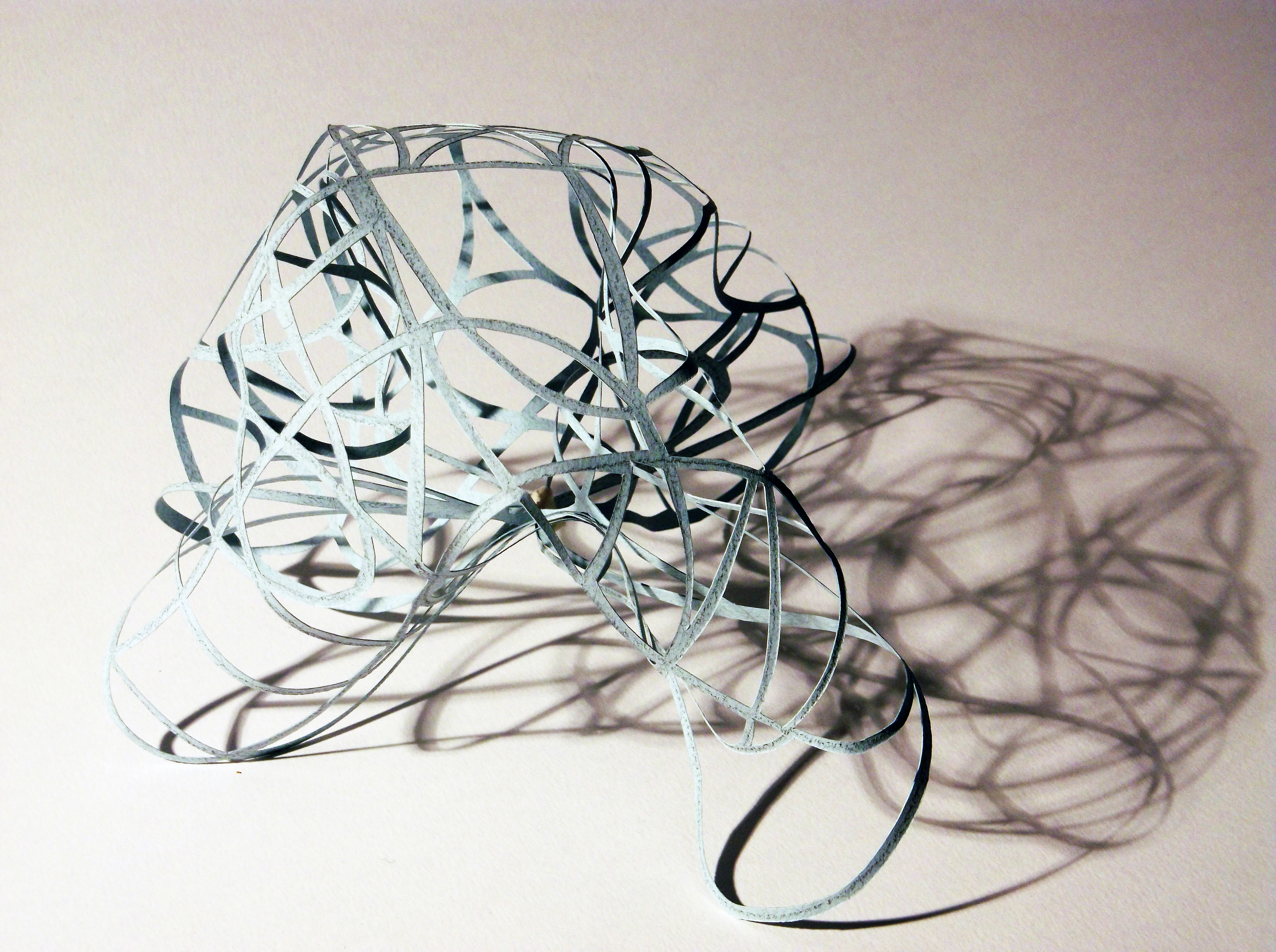 These forms were created using simple cutting techniques, beginning with a continuous line drawing and then creating space for movement by removing sections with a cutting knife. Shining a simple light through them produces interesting and a little haunting shadows and feeling.
