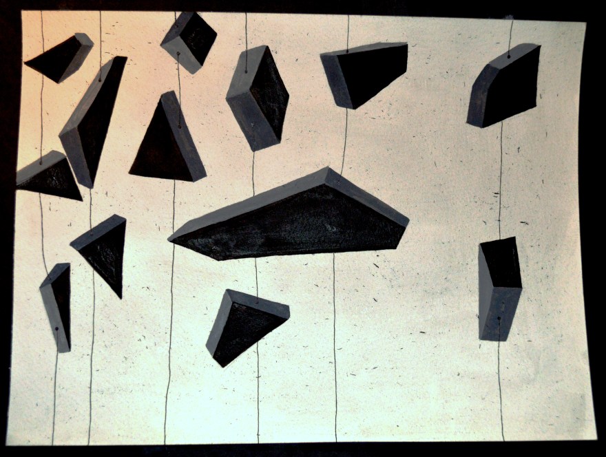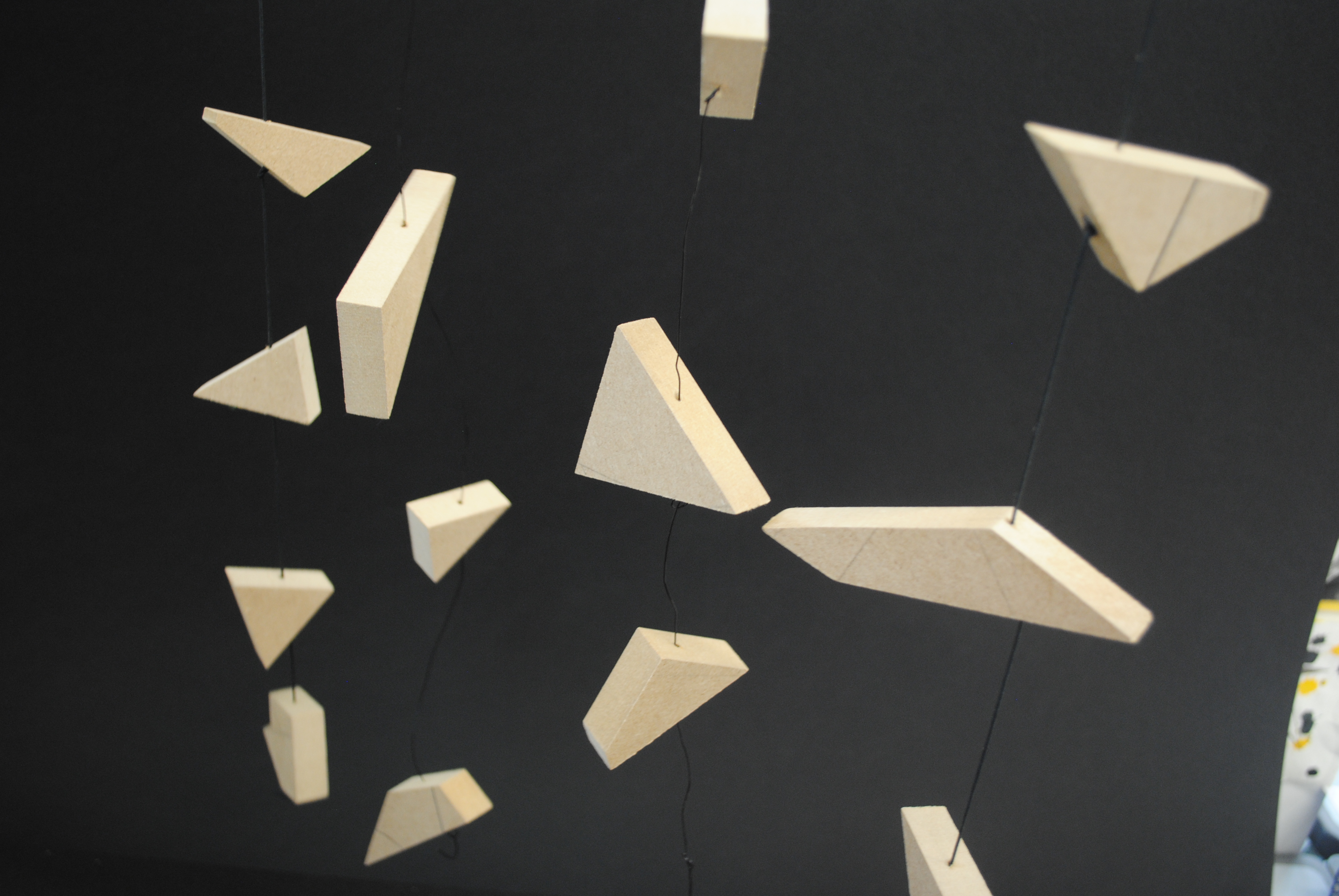 Studio experiments with suspended wooden fragments. What are the sonic properties of the materials? Trying databending and importing photographs and painted variations of the installation to create a sound piece. Sounds to come…