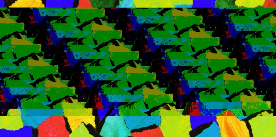 Transposing musical notes to colours using Harbissions Sonochromatic scale was the starting point for this databending process. The imagery is made in response to ‘Hopopono’ by Manchester band GoGo Penguin and started as fragments of painted paper (transposed B flat notes to colours) before being manipulated in photoshop and databended through Audacity where I applied various sonic filters and exported the image files.
