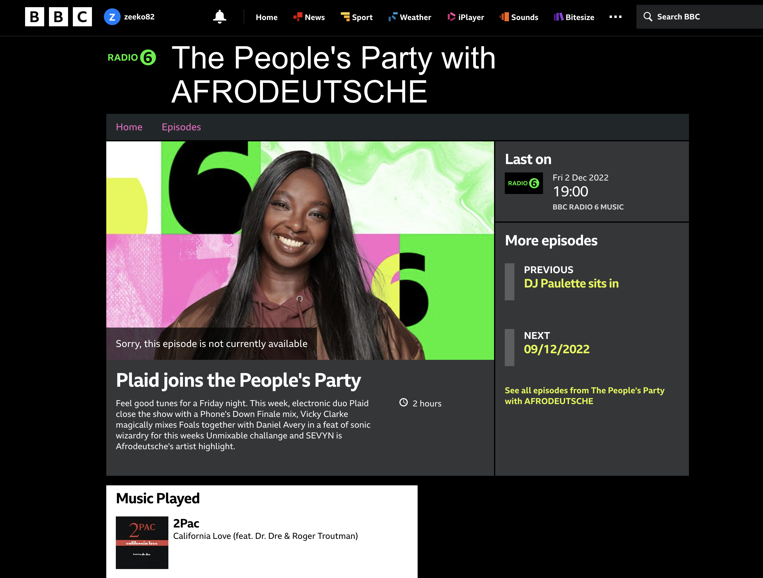 On Friday 2nd December 2022, I was thrilled to feature on Afrodeutsche’s The People’s Party show on BBC 6 Music showcasing my debut album SLEEPSTATES and taking on the unmixable challenge (Foals & Daniel Avery.) The feature included a first radio play of album track, Sync Whole and a behind the scenes chat, big thanks to Afrodeutsche for giving my work this platform.