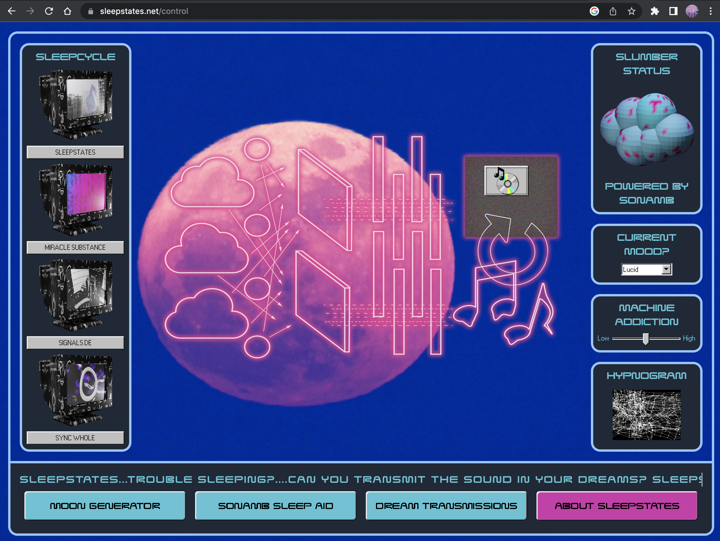SLEEPSTATES.NET is a browser-based work where the user navigates to different states of algorithmic slumber, a sleep-cycle of audiovisual interactions that takeover their screen. Exploring themes of machine addiction and autonomy, sleep sanctity, the networked condition and how citizens are subjected to emotion extraction via platform capitalism, these dream transmissions journey through the techno-emotional states of slumber we experience between humans and machines late at night. This piece accompanies SLEEPSTATES, the debut album from SONAMB.