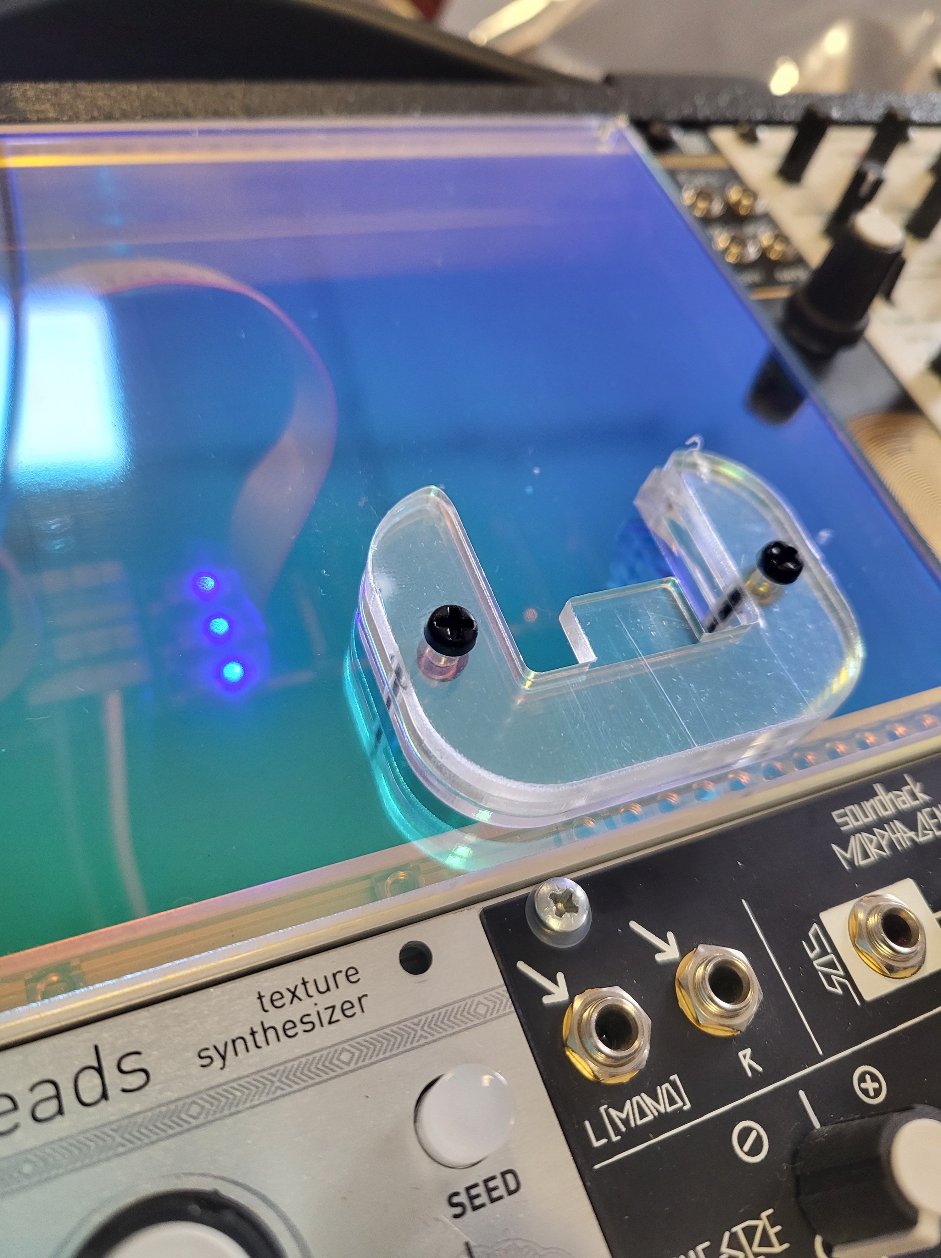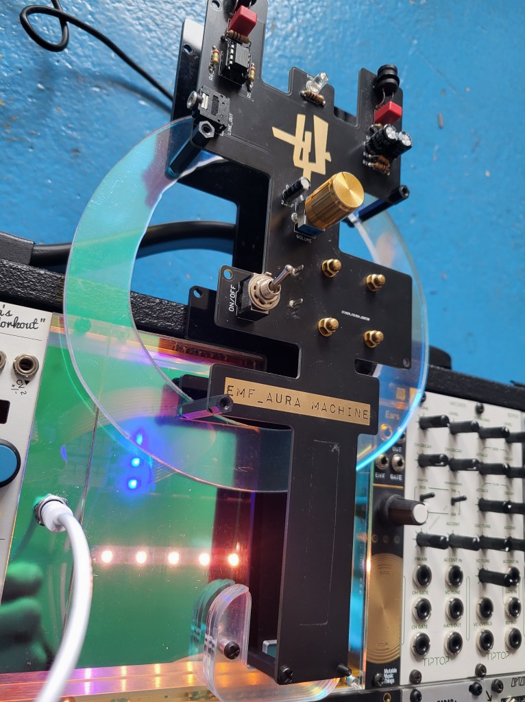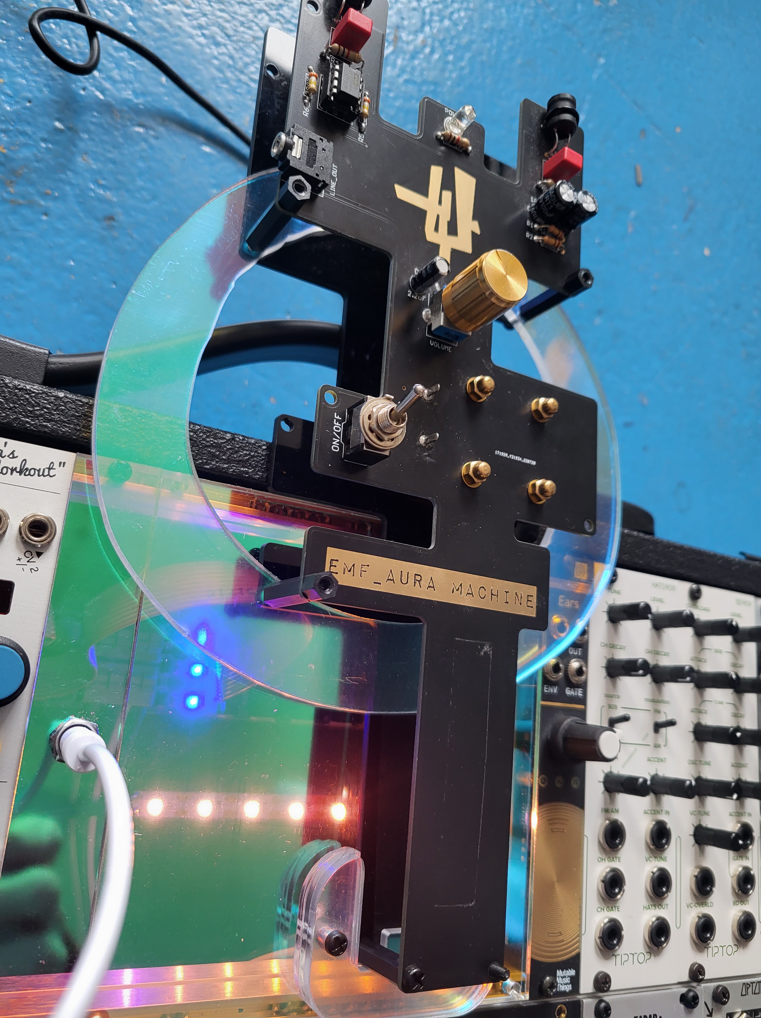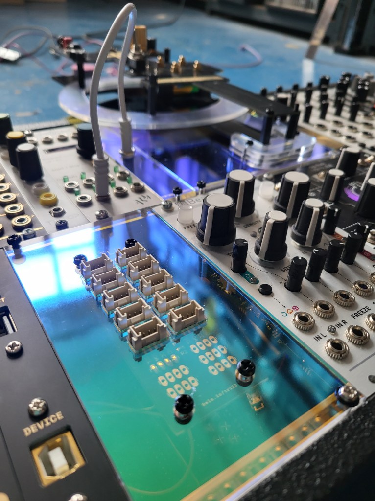 Using the Bela PEPPER module, we wrote a PureData patch that would control the playback and manipulation of the AI cotton mill samples via touch. We used two TRILL sensors to do this, the square one controlled the volume and speed on an XY axis, and the circle sensor controlling a granulated loop through touch. The sensors were fitted to my sculpture and used for live improvisation throughout the set. Another DIY aspect of the modular setup included working with my EMF circuit, which sampled and amplified the live electricity of the modular and fed it back into the system. We designed and laser cut three bespoke units; a breakout board for the TRILL sensors, a CV controlled light reactive unit and a holster for the EMF circuit. Special thanks to Chris Ball and Luke Dobbin for helping me with the coding on this!