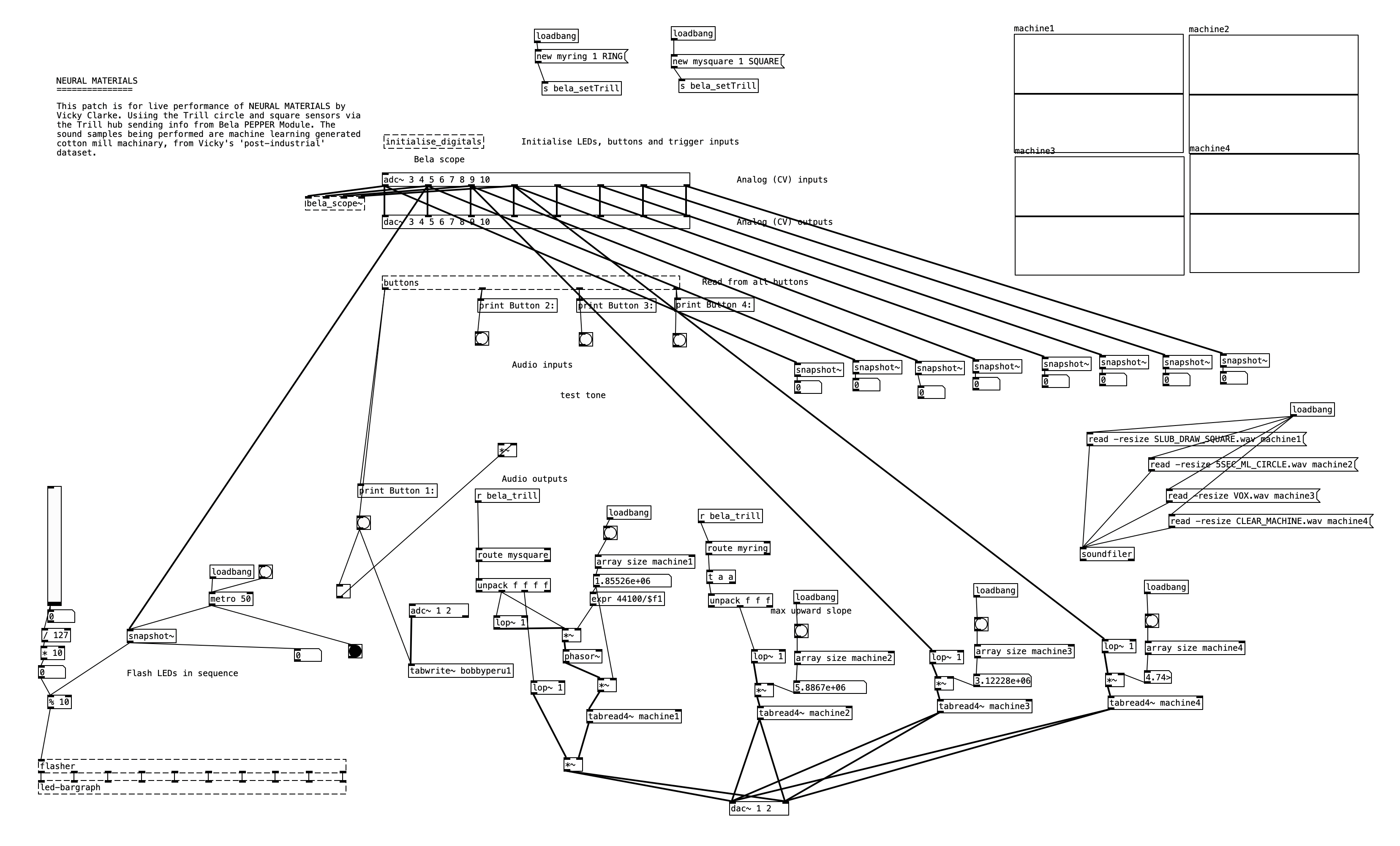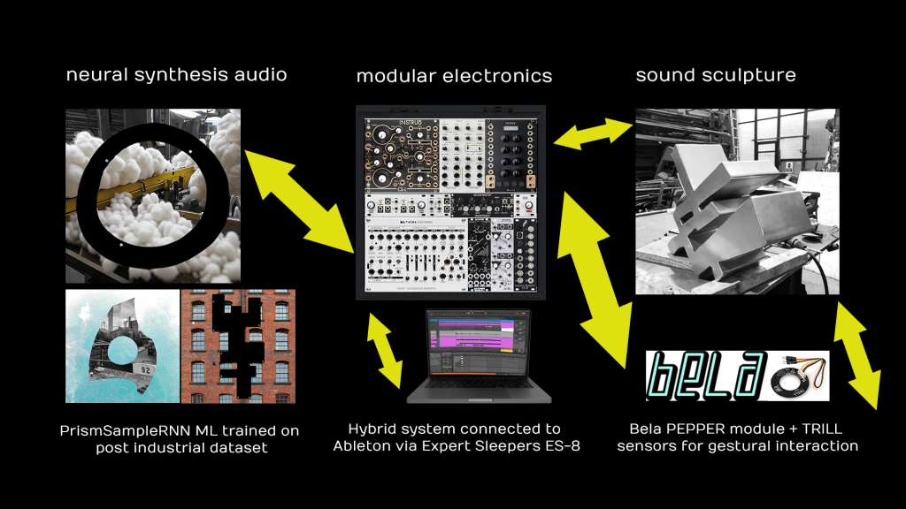 For NEURAL MATERIALS I created a new performance system for AI, modular electronics and sound sculpture; a hybrid setup, with Ableton linking to the modular. With the Bela technology I used their PEPPER module for sample manipulation, controlled via their gestural sensors called TRILL. The aim was to be more hardware focused for live, and explore the ML materials more tangibly through gesture and feedback. To develop sound content for the project I undertook a series of studio experiments and workflows.