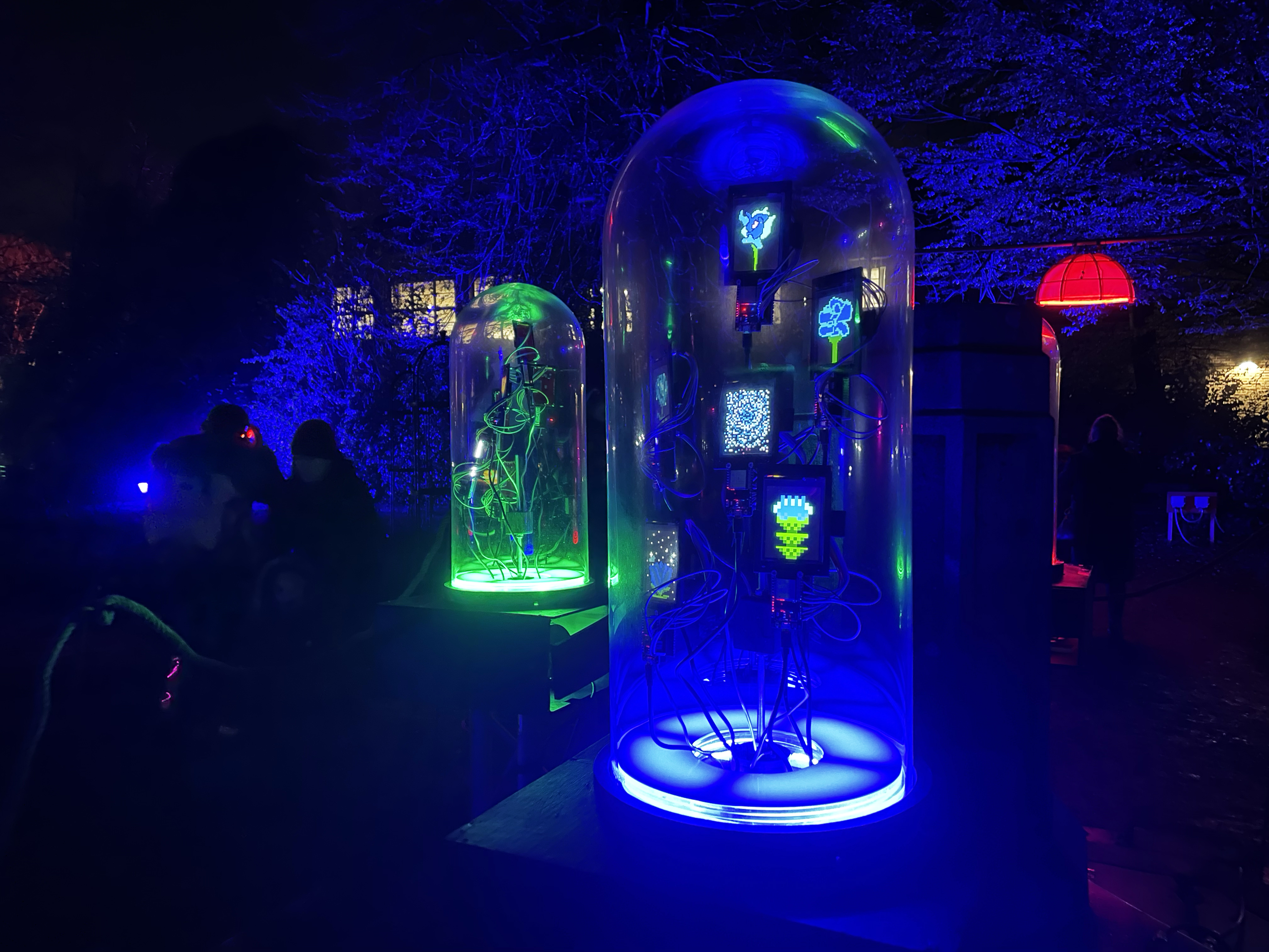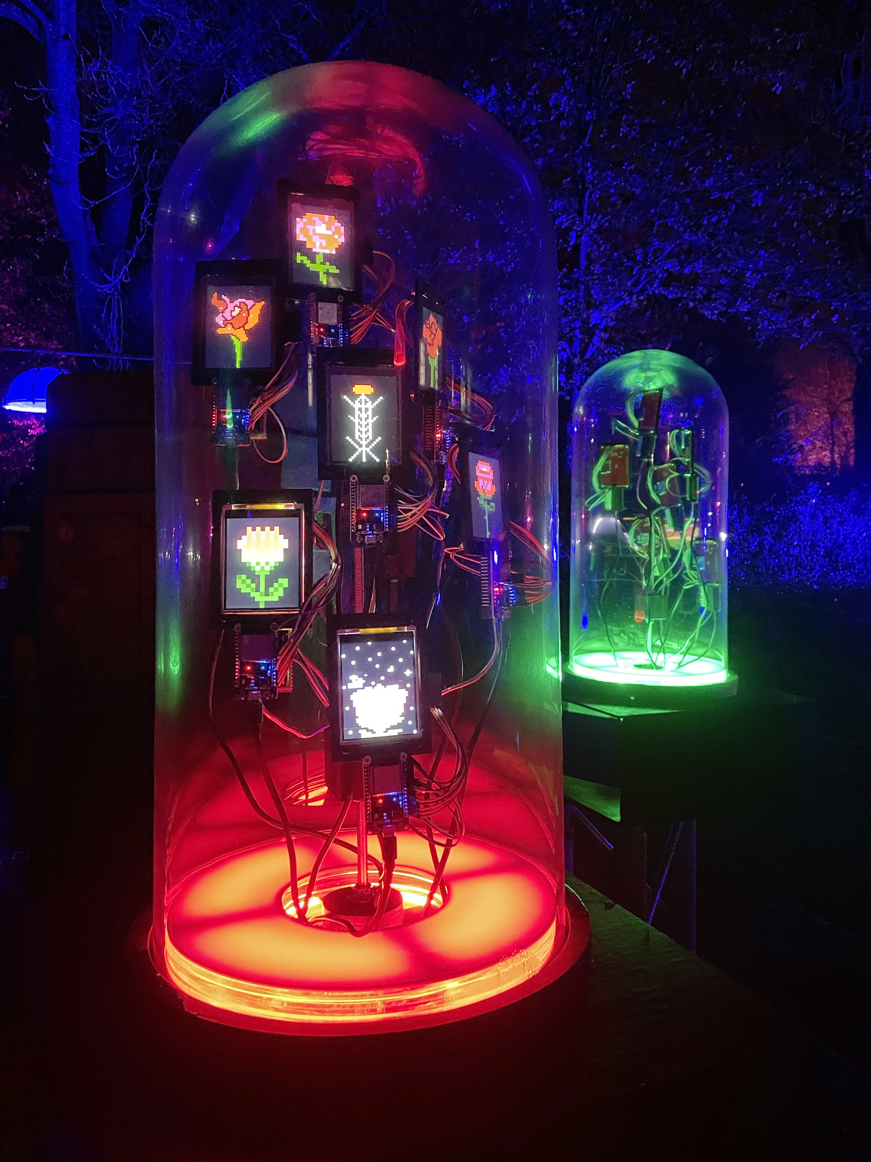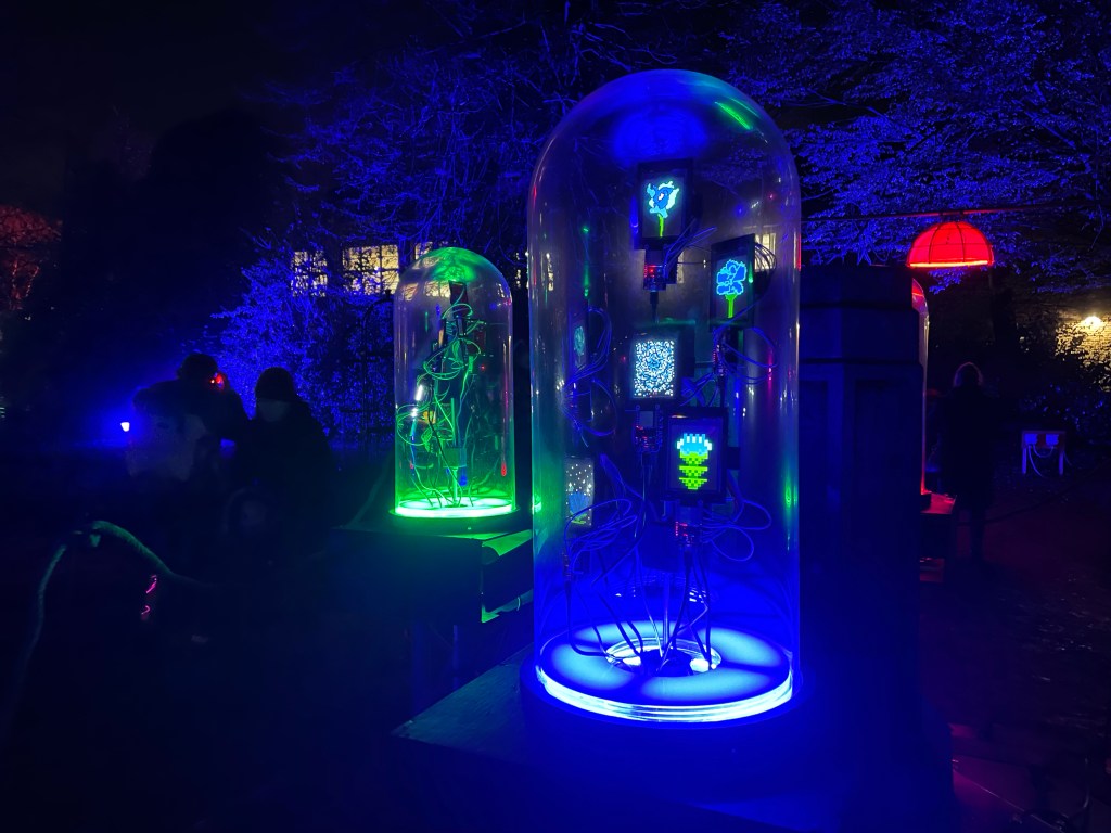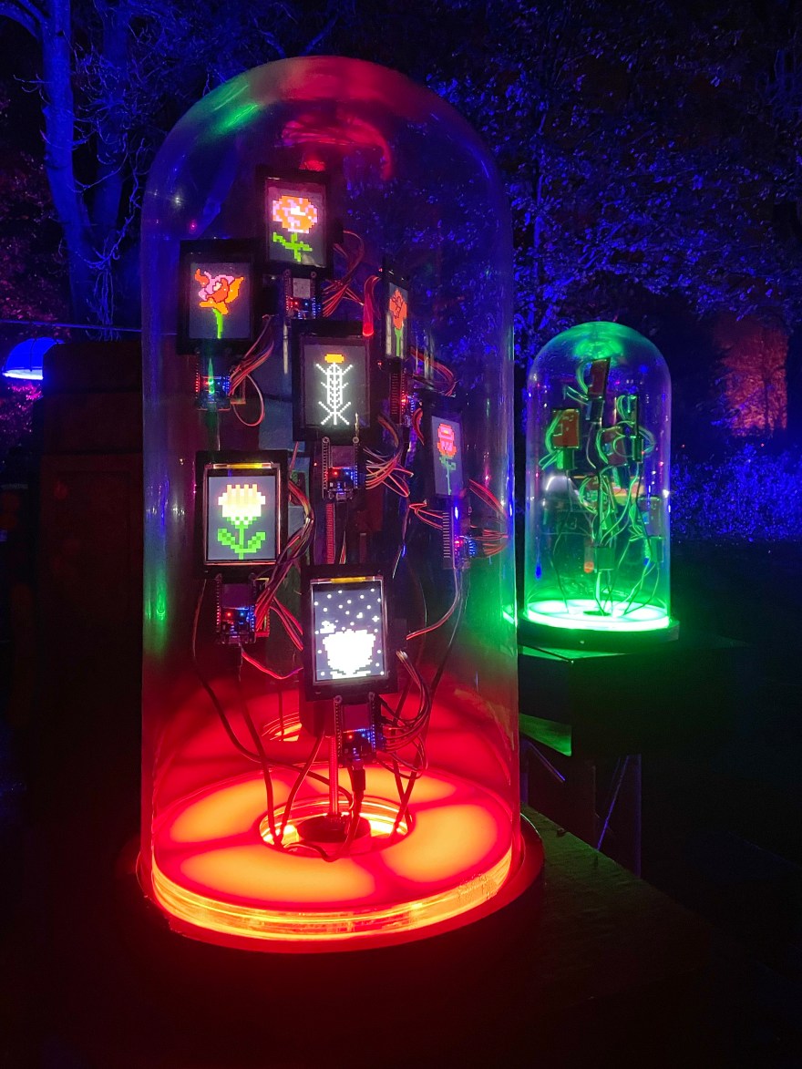 Rose Garden Broadcast invites audiences to wear wireless headphones and tune in to three different ‘earth to sky’ frequency bands broadcast from electronic, illuminated radio sculptures housed in Victorian glass cloches. Though dormant in winter, Rose Garden Broadcast will ‘bring back the blooms’ as digital twins. The cloches will house LED screens displaying pixel art roses, digital doppelgangers of the rose species as created by local young people from Wigan.