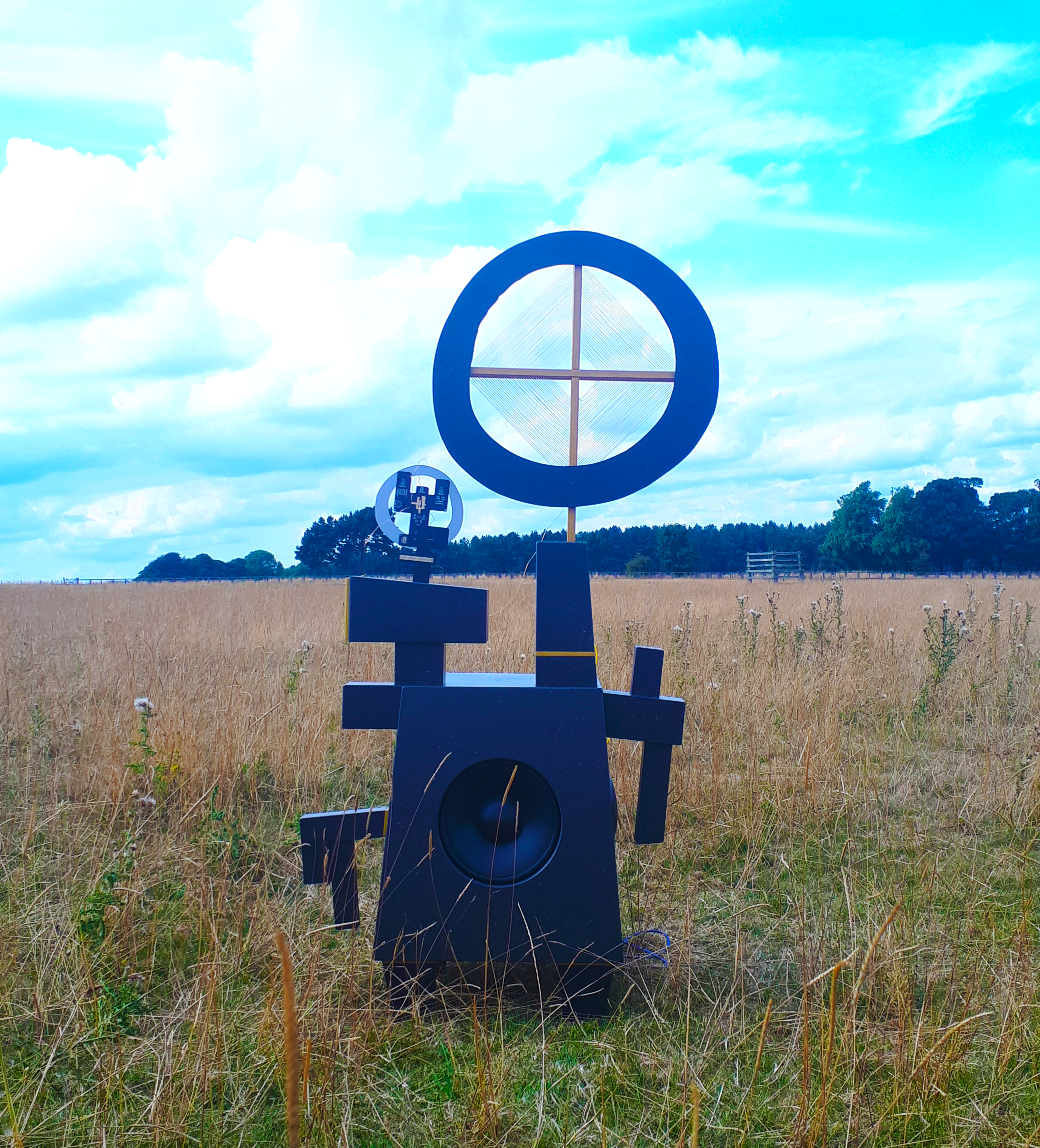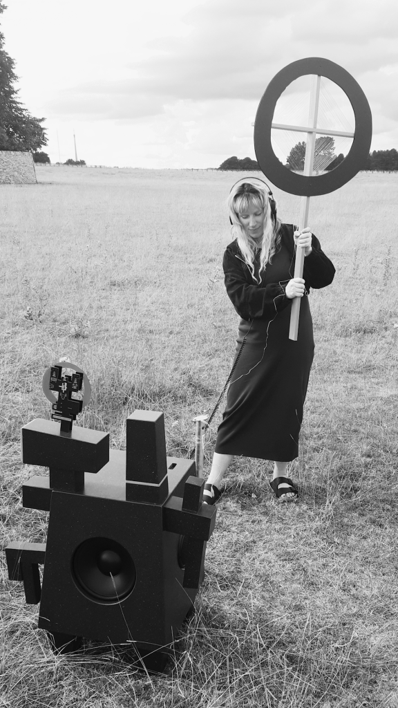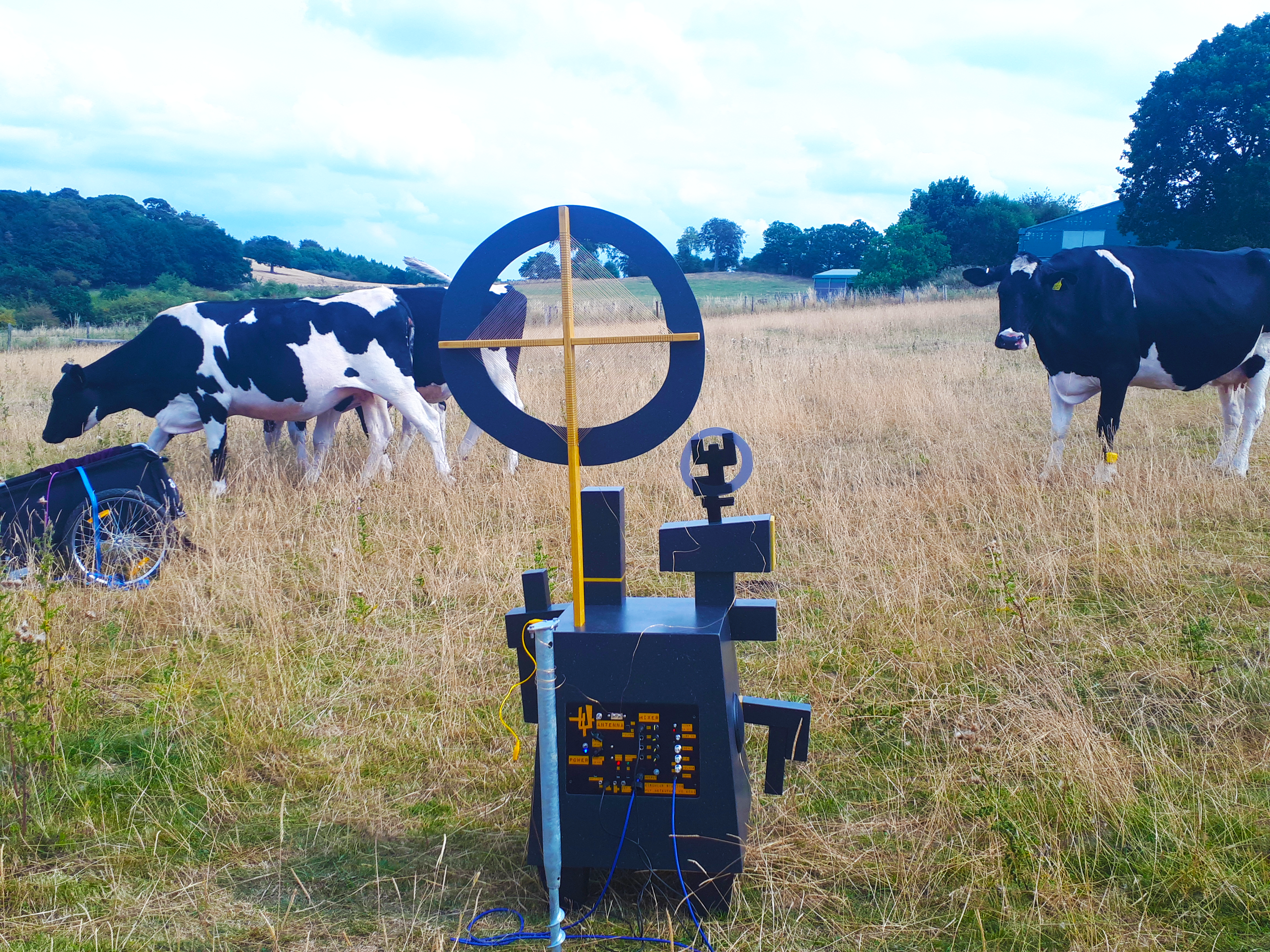 The electronics and interface for the piece encompass a VLF (very low frequency) circuit, a patchable mixer where you can opt to plug in the EMF detector and stereo amplification through a bass speaker and two mids. There is a detachable loop antenna and for grounding a large earth spike, I worked with long term collaborator Creative Technologist Chris Ball who helped me with circuit amplification and testing at Yorkshire Sculpture Park for our first recordings, which attracted a fair few cows! You can listen to these first test recordings below.